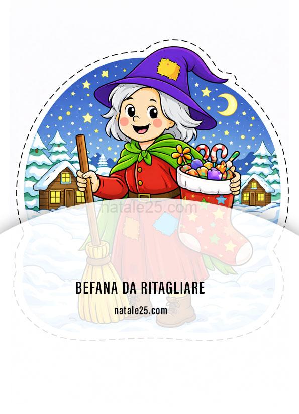 Questa Befana da ritagliare si presta a essere utilizzata come sagoma singola, mantenendo un aspetto pulito e leggibile. L’insieme valorizza la forma del personaggio, lasciando spazio alla tradizione e rendendo la figura immediatamente utilizzabile. Clicca il PDF