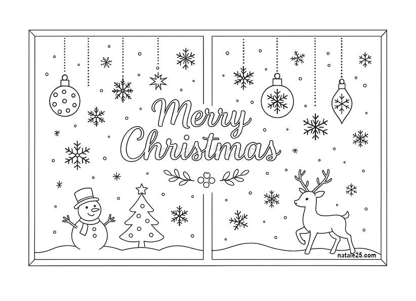 Decorazione natalizia per finestra da colorare pensata come bozzetto ispirazionale per mostrare come addobbare la finestra con soggetti natalizi.