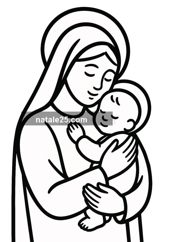 Maria tiene tra le braccia il piccolo Gesù in una scena piena di tenerezza e serenità. L’immagine rappresenta un momento di amore profondo e di pace, perfetto per accompagnare attività didattiche o momenti di catechismo.