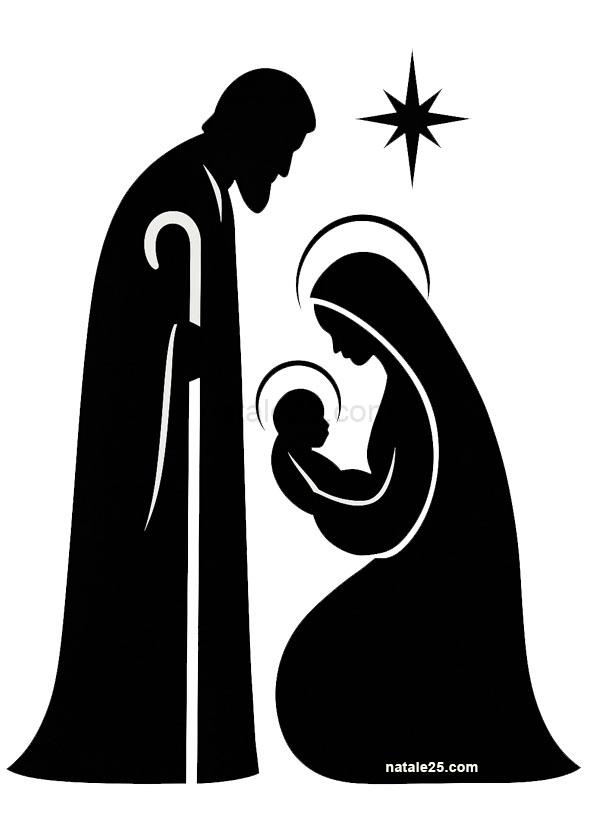 La composizione essenziale e priva di colori mette in risalto il significato più autentico del Natale: l’amore, la nascita e la speranza. Questa immagine, realizzata come silhouette nera su fondo chiaro, si adatta perfettamente a contesti religiosi e decorativi, mantenendo un tono elegante e rispettoso.